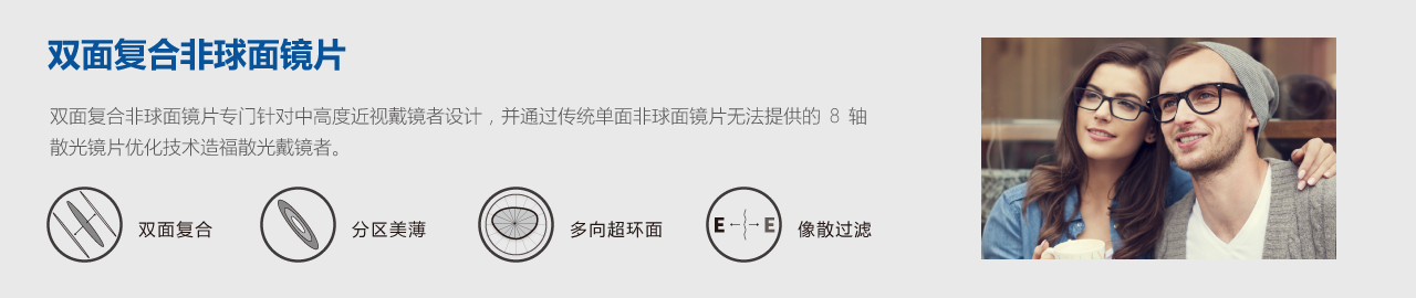 雙面復合非球面鏡片專門針對中高度近視戴鏡者設(shè)計,并通過傳統(tǒng)單面非球面鏡片無法提供的8軸散光鏡片優(yōu)化技術(shù)造福散光戴鏡者。蘇大明世®最新研發(fā)的第二代雙面復合非球面鏡片集像散過濾、分區(qū)美薄、一對一補償值和多向超環(huán)面四大創(chuàng)新技術(shù),在為中高度近視佩戴者提供外觀輕、薄、平的鏡片的同時,最大限度地保留像差矯正的鏡片的周邊視野清晰,戴鏡后對比敏感度提升的優(yōu)點。是中高度近視尤其是散光戴鏡者首選的外觀與內(nèi)在功能性和適應(yīng)性統(tǒng)一的鏡片光學設(shè)計。